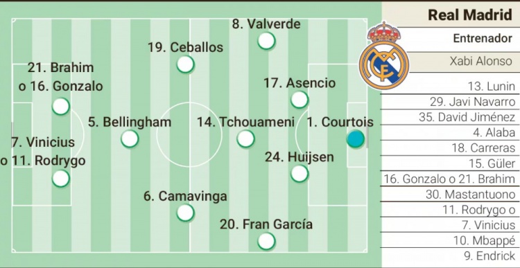根据《阿斯报》的预测,皇马本场首发阵容可能为:库尔图瓦;巴尔韦德、劳尔-阿森西奥、赫伊森、弗兰-加西亚;琼阿梅尼、卡马文加、塞巴略斯、贝林厄姆;迪亚斯或冈萨洛、维尼修斯或罗德里戈。这样的阵容配置,无疑将让球迷们期待一场精彩的较量。