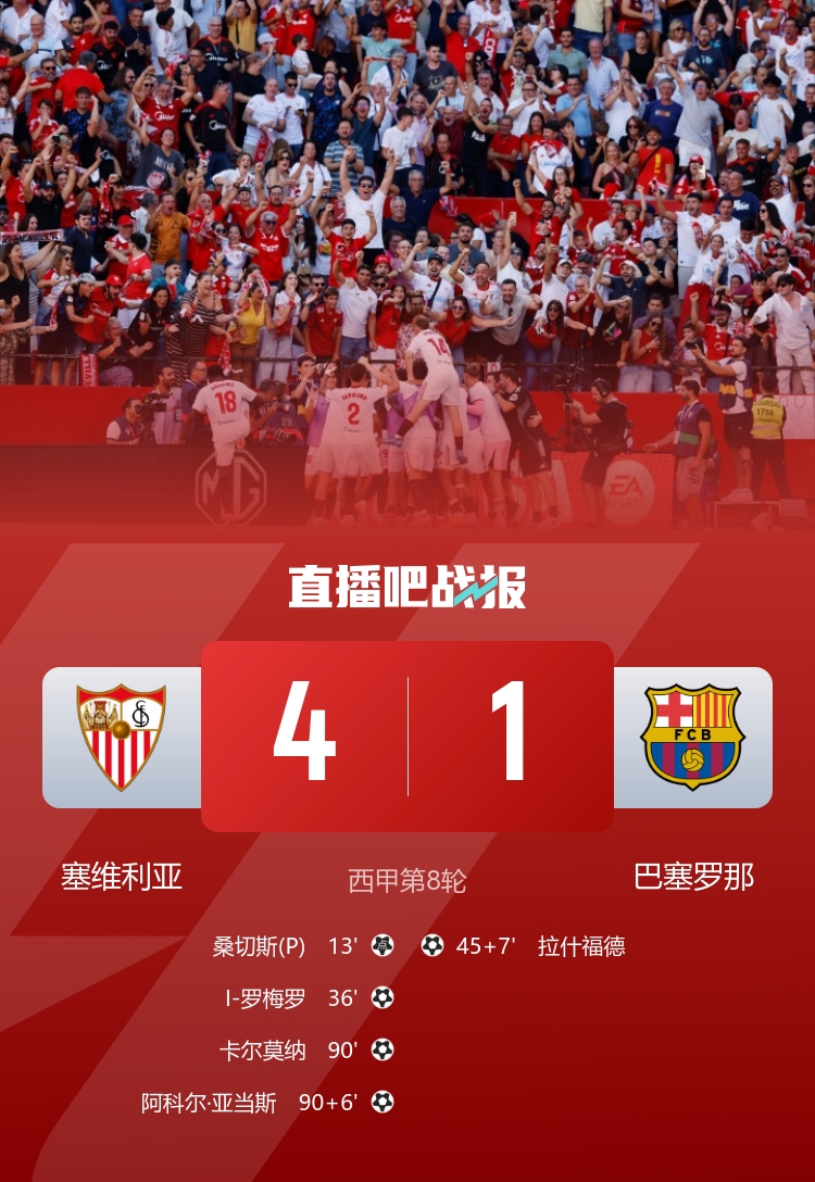 在2025-26赛季西甲联赛第8轮的一场较量中,塞维利亚在自己的主场皮斯胡安球场迎战巴塞罗那。比赛于北京时间10月5日22:15进行,最终以塞维利亚4-1战胜巴萨,令后者在各项赛事中遭遇两连败,距离榜首的位置也缩小至2分。