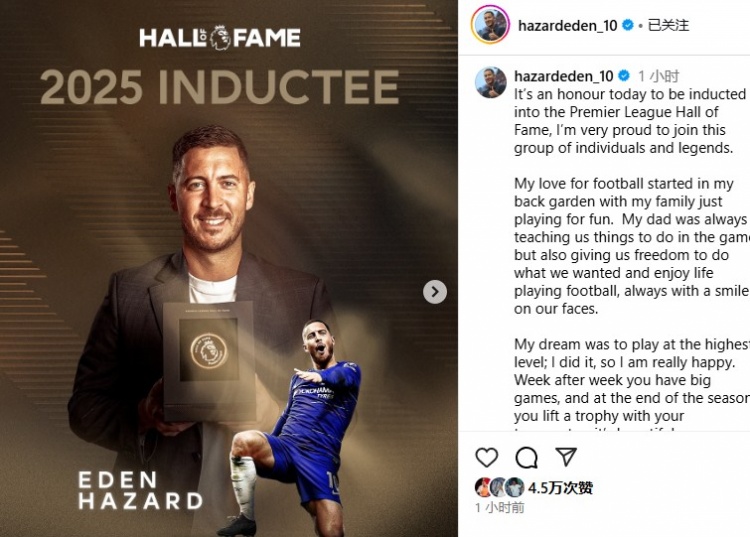 英超联赛近日正式宣布,切尔西传奇球星阿扎尔正式入选英超名人堂。这位比利时球员在社交媒体上表达了自己对这份殊荣的激动心情,令人倍感温暖。