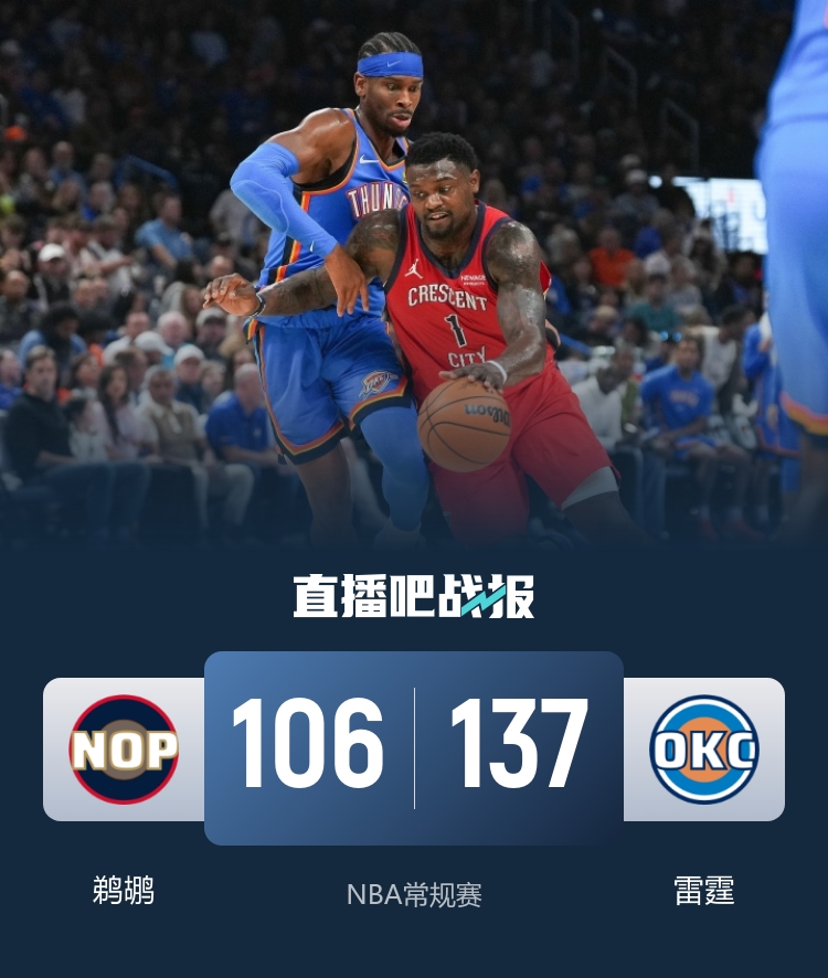 下半场开始,雷霆的亚历山大打得如鱼得水,不仅自己得分,还助攻队友,牢牢把控着比赛节奏,分差一度扩大到30分以上。进入最后一节,雷霆稳扎稳打,保持着大优势,而鹈鹕则显得力不从心,无法逆转局势。整场比赛下来,雷霆以137-106的比分力克鹈鹕,成功将连胜纪录扩大到七场,而鹈鹕则忍无可忍,遭遇了六连败。