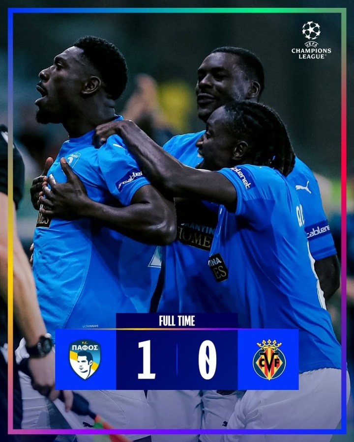 在11月6日的欧冠小组赛中,来自塞浦路斯的帕福斯球队在主场以1-0击败了比利亚雷亚尔。这是这支欧冠新晋球队历史上首度在正赛中赢得胜利,令人振奋不已。经过四轮激烈的比赛,帕福斯以1胜2平1负的成绩排在小组的第20位,攻入2球,失球5个。