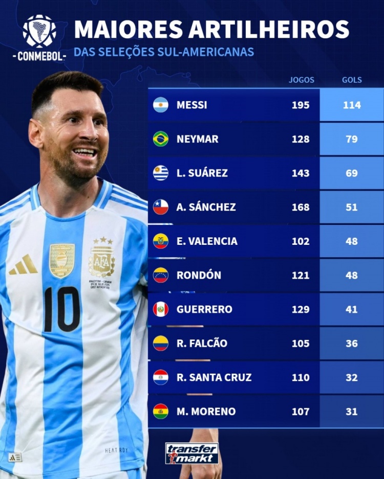 首先,不得不提的就是阿根廷的梅西。他在国家队的195场比赛中打入114粒进球,无疑是蓝白军团的骄傲。梅西不仅用技术和智慧征服了无数球迷,也为阿根廷足球书写下辉煌的篇章,成为南美国家队历史射手王中的佼佼者。
