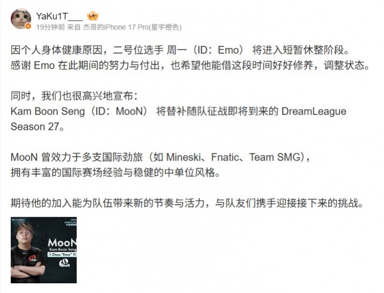 12月4日讯 DOTA2战队经理YaKu1T宣布了一项重要的人员变动:由于个人健康原因,二号位选手周一(ID:Emo)将暂时进入休整期。战队对此表示衷心的感谢,感谢Emo在过去的努力和贡献,并希望他能够利用这段时间好好养病,调整好自己的状态,以便更好地回归。