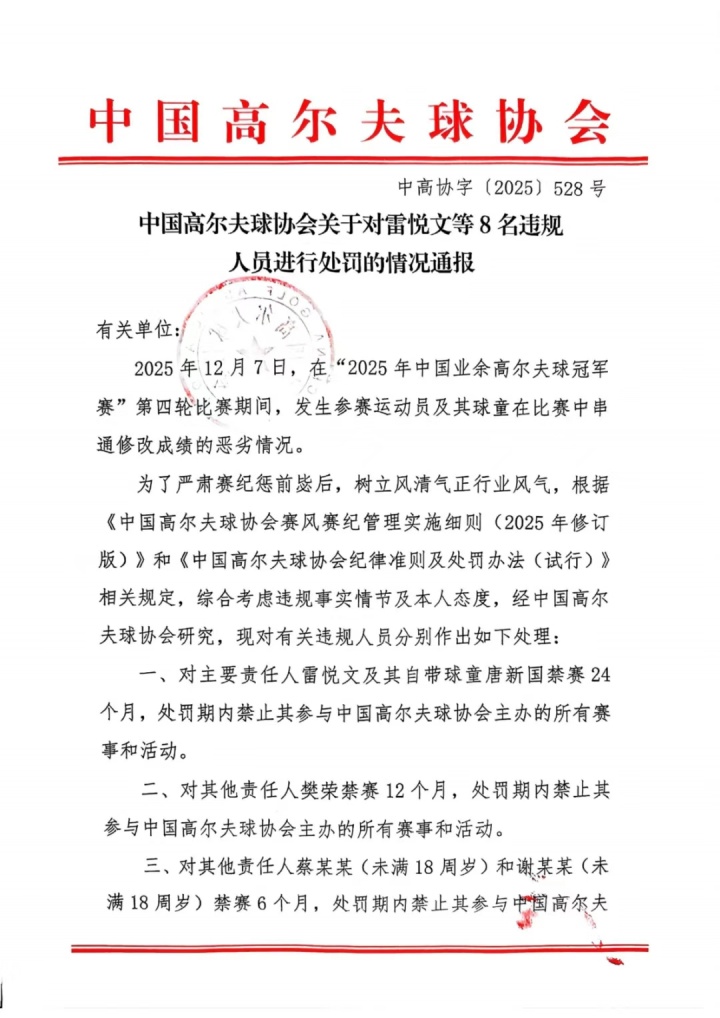 中国高尔夫球协会为维护比赛的公平公正,决定严肃处理涉事人员。雷悦文和唐新国因其主要责任,均被处以24个月的禁赛,禁止他们在这个时期内参与任何由协会主办的赛事和活动。此外,其他涉及的责任人樊荣被禁赛12个月;而两位未满18岁的参赛者蔡某某和谢某某则面临6个月的禁赛处罚。