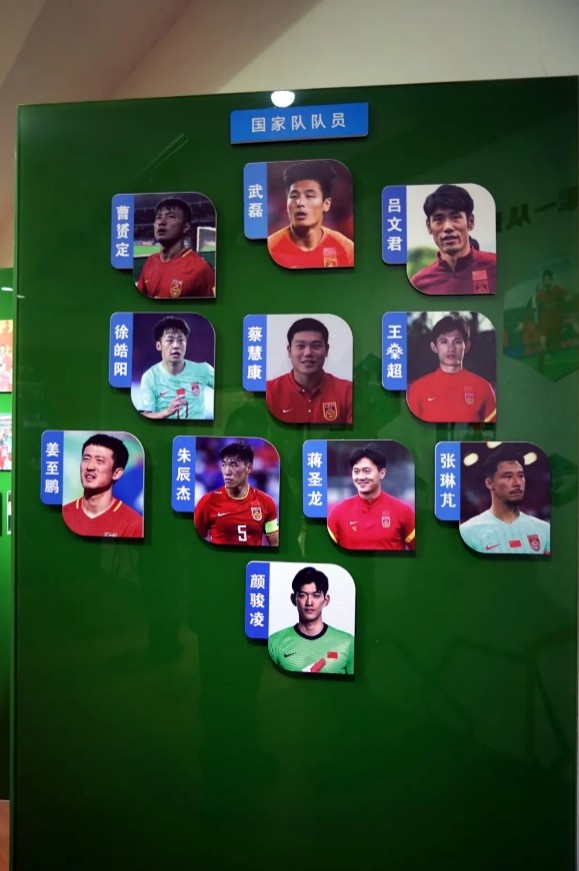 之前基地荣誉室展板上只展示了武磊、张琳芃等几位球员的照片,展现方式也只是横排的形式。而现在全新的展板上,展示了11名球员,排列方式刚好符合一支球队的首发阵容。这指向了徐根宝所培养的“崇明子弟兵”中精选出的最佳阵容。