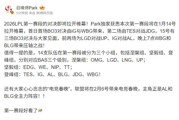 据最新消息,2026年LPL第一赛段即将在1月14日揭幕。微博知名爆料人“召唤师park”透露,首日的对阵将由iG与WBG展开首场BO3对决,随后,TES与JDG的较量将紧接其后。1月15日的比赛中,将呈现三场BO3对决,其中前两场分别是LGD对UP以及IG对AL,晚上7点,WBG与BLG将带来激情四溢的压轴之战。