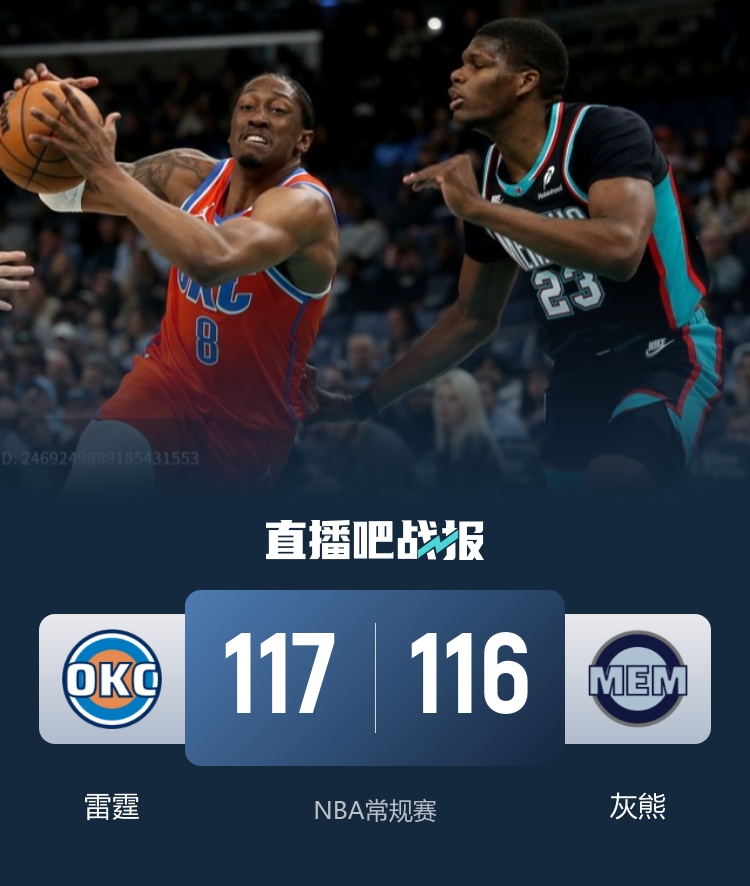 1月10日,NBA常规赛继续上演恩怨对决,灰熊在主场迎来联盟领头羊雷霆。关于这场比赛,大家多少都带着些许期待,毕竟雷霆刚刚结束了连败,然而缺少了两大核心——亚历山大和霍姆格伦,似乎一下就把悬念打了个稀碎。