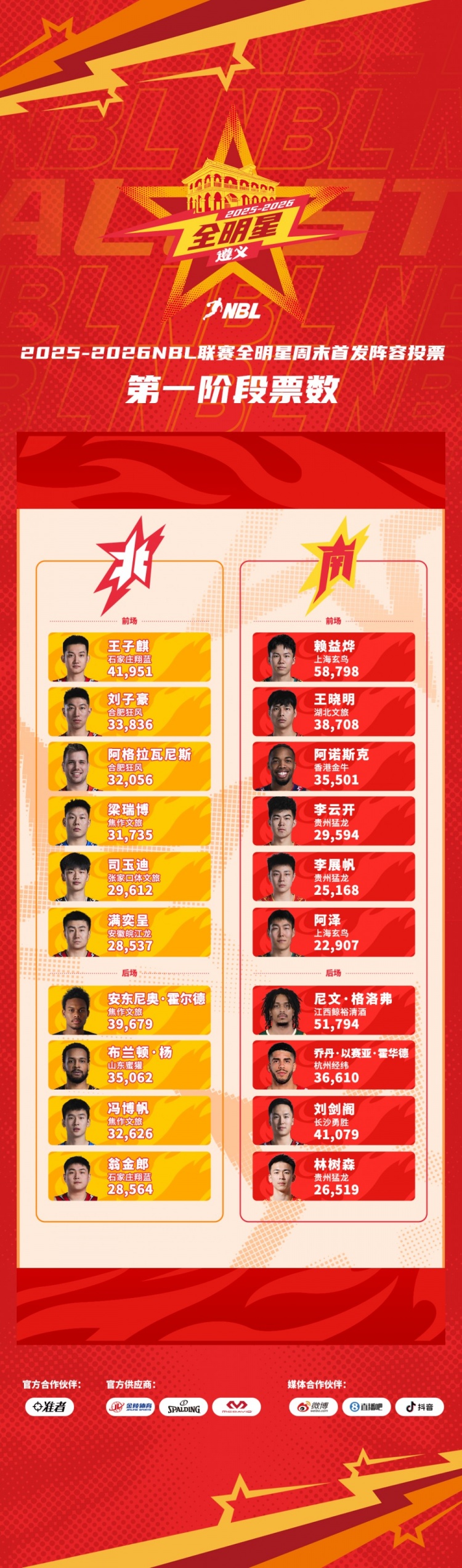 2025-2026 NBL联赛全明星周末首发阵容的第一阶段投票结果已于1月15日晚24点正式公布。在此次投票中,上海玄鸟的明星球员赖益烨凭借58798票高居榜首。而来自北区的石家庄翔蓝球员王子麒暂时以41951票位居第二。