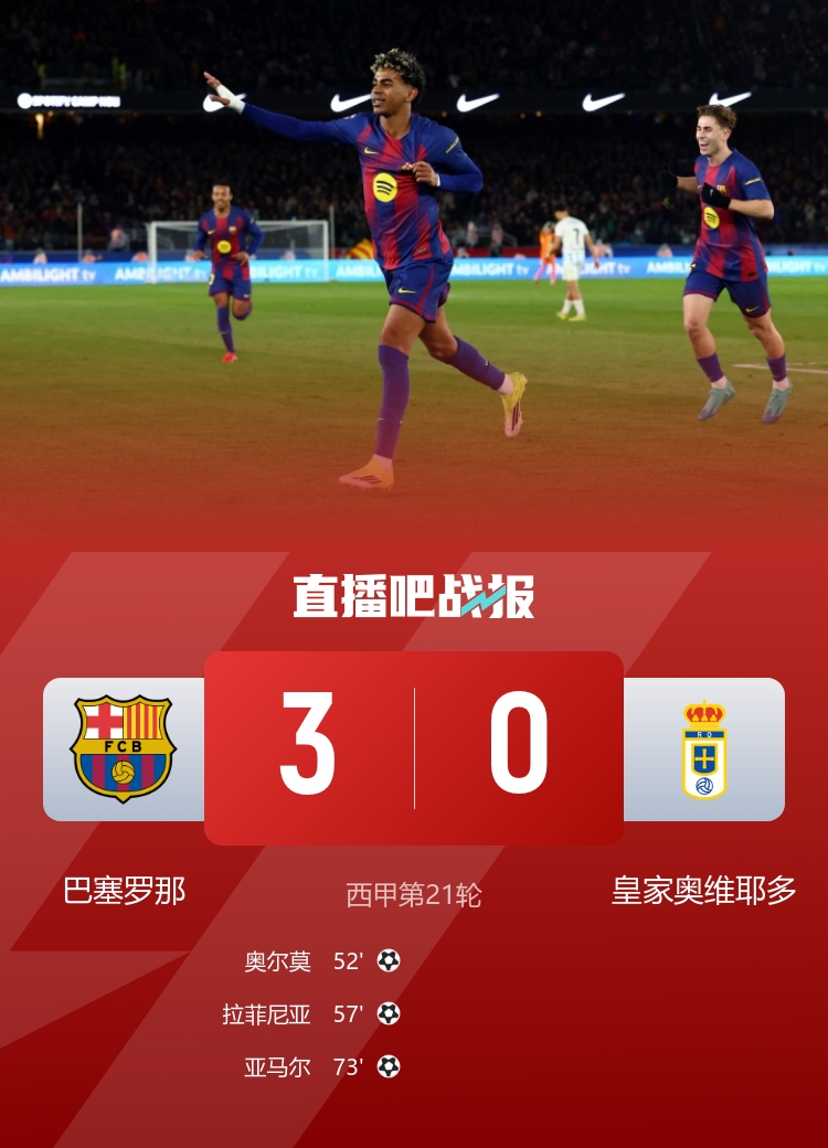 1月26日讯 北京时间1月25日23点15分,西甲第21轮中,巴塞罗那在诺坎普球场迎战皇家奥维耶多。比赛上半场,巴萨前锋莱万错失了一些良机。进入下半场后,皇家奥维耶多出现两次失误,巴萨的奥尔莫和拉菲尼亚分别把握住机会进球,最终由亚马尔精彩的侧钩锁定了胜局。比赛结束时,巴萨以3-0战胜皇家奥维耶多。这场胜利使得巴塞罗那积累了52分,重新夺回积分榜榜首位置,领先皇家马德里1分,而皇家奥维耶多则以仅有13分继续排名垫底。
