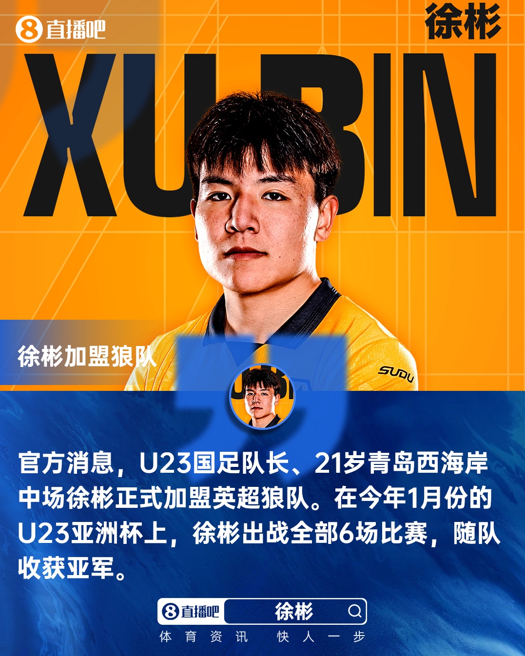 01月30日讯,英超俱乐部狼队近日宣布,21岁青岛西海岸中场、U23国家队队长徐彬正式以自由转会的方式加盟球队。根据官方消息,徐彬将在本赛季剩余时间内,通过租借形式在英格兰国内联赛中锻炼,以提高其比赛经验。