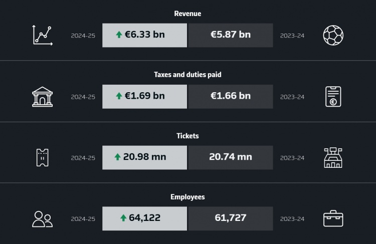 首先,职业足球的总收入达到了63.3亿欧元,其中17亿欧元被用于缴纳公共财政的税费。值得注意的是,2024/25赛季德甲俱乐部的总收入首次突破50亿欧元,相较于2023/24赛季提高了3.208亿欧元,增幅为6.7%。同时,德乙联赛的营收也达到12.1亿欧元,展现出持续增长的势头,并且整体收支实现了正平衡。