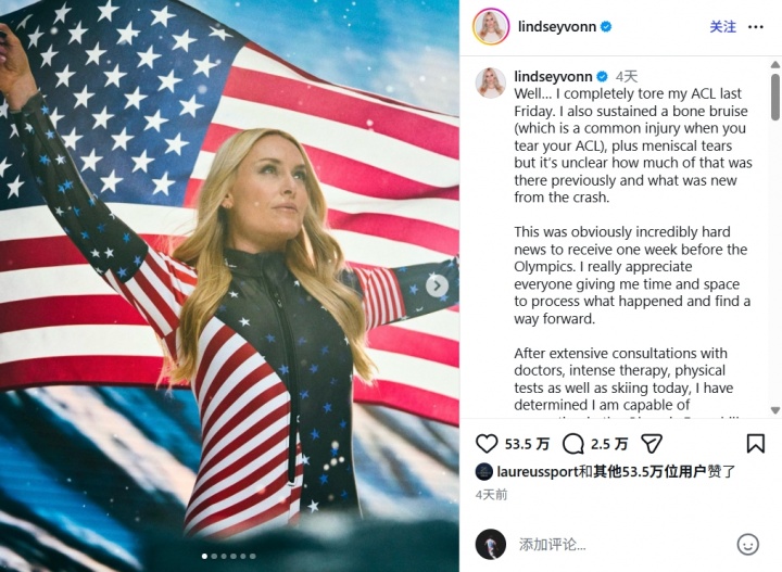 在她发布的社媒中,沃恩提到自己的前交叉韧带完全撕裂,并伴随有骨挫伤及半月板撕裂,她指出自己不清楚这些损伤中哪些是之前造成的,哪些是此次事故导致的。她表示,奥运会前一周听到这样的消息,无疑是一个沉重的打击,但她感谢关心自己的朋友们给予的时间,帮助她消化这一切并找到前进的方向。