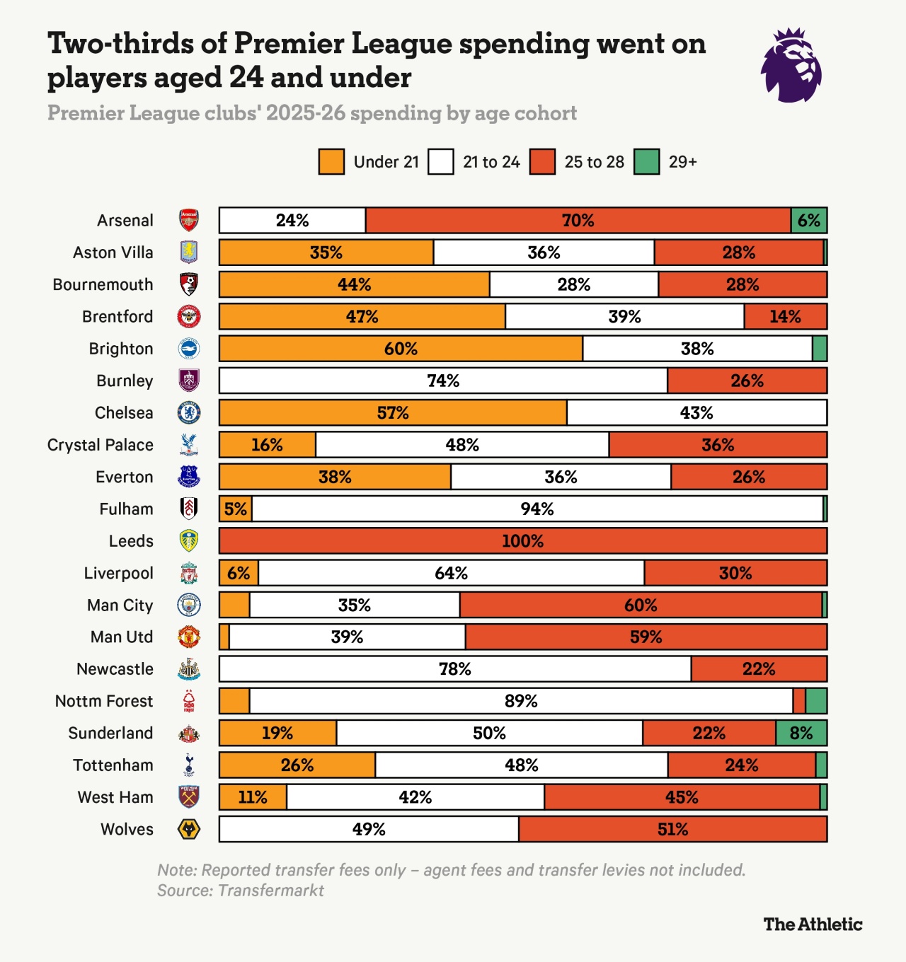 在这个冬季转会期,英超各大俱乐部的引援支出超过了35亿英镑,揭示了各队在人员构建上的不同策略。根据《TA》的统计数据,我们发现49%的资金主要流向了21至24岁的青年球员,这是该年龄段连续八个赛季成为转会支出主力。
