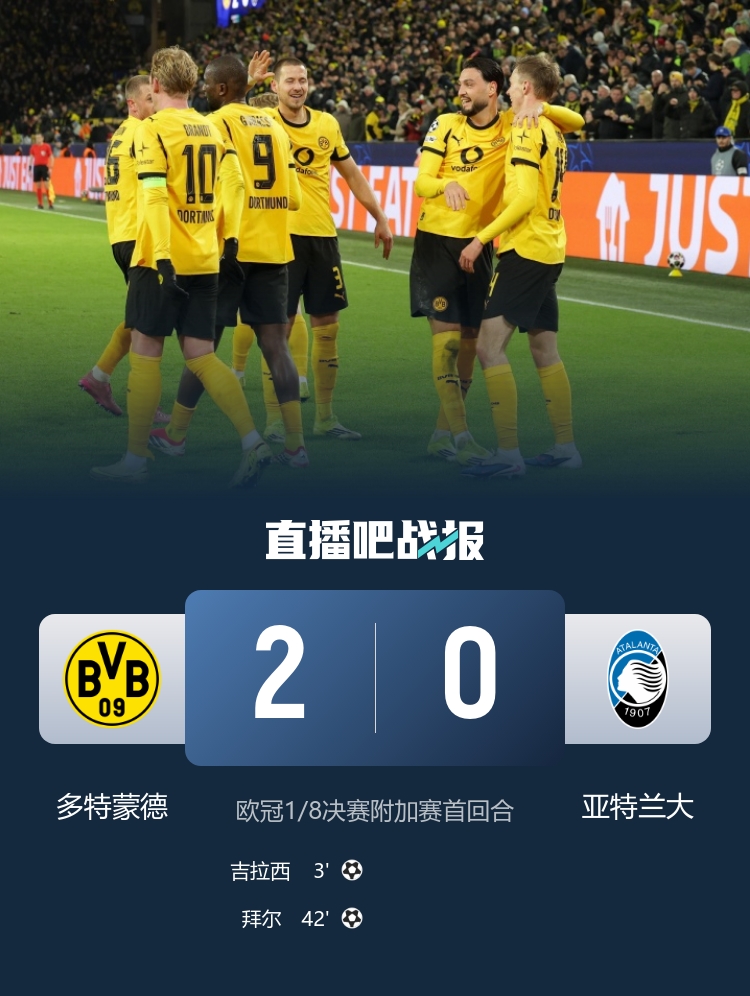 北京时间2月18日凌晨4:00(实际开球时间为4:15),在欧冠1/8决赛首回合的较量中,多特蒙德在伊杜纳信号公园球场迎战亚特兰大。这场比赛上半场,多特蒙德表现出色,率先打破僵局,吉拉西在第3分钟通过头球为球队取得领先,拜尔助攻成功,帮助多特蒙德以1-0领先。紧接着在第42分钟,多特蒙德再次发起反击,吉拉西在左路突进传中,拜尔及时赶到将球打入空门,比分改为2-0。
