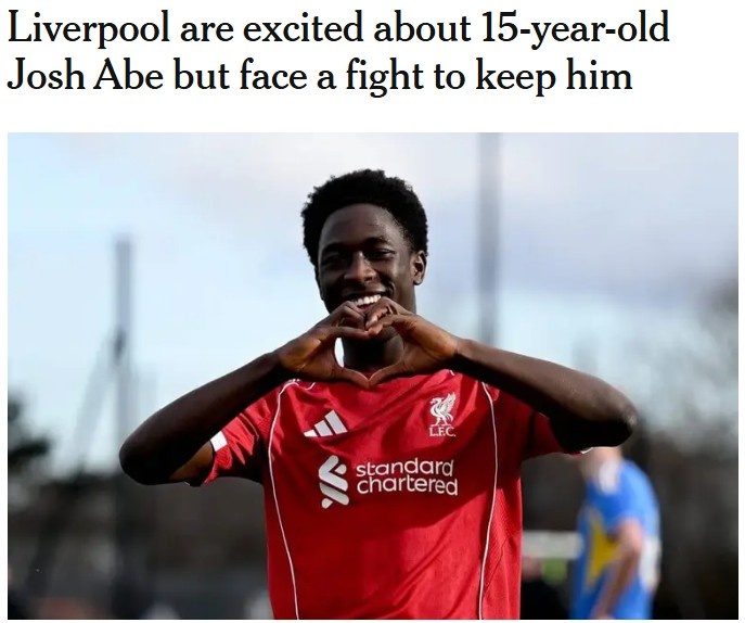 2月18日讯,The Athletic报道称,利物浦青训中的新星乔希·阿贝正在引起越来越多的关注。这位年仅15岁的边锋,主要踢右路,左脚发力,最近几周多次被召入一线队训练,显示出他的潜力和能力。