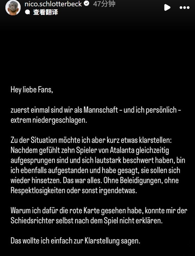 赛后,施洛特贝克通过社交媒体表达了他对这一判罚的不满与困惑:“亲爱的球迷们,大家好!我想告诉你们,整个团队,包括我自己,心中充满了失望。”他继续说:“我想对发生的事情做一个澄清:在那一刻,似乎有十名亚特兰大的球员同时在抗议,我站起身来只是想让他们冷静下来,这并没有带有任何侮辱或不尊重的意图。事实上,就连赛后的裁判也没能给我合理的解释,说明为什么我会拿到红牌。对此我只是想让大家知道。”