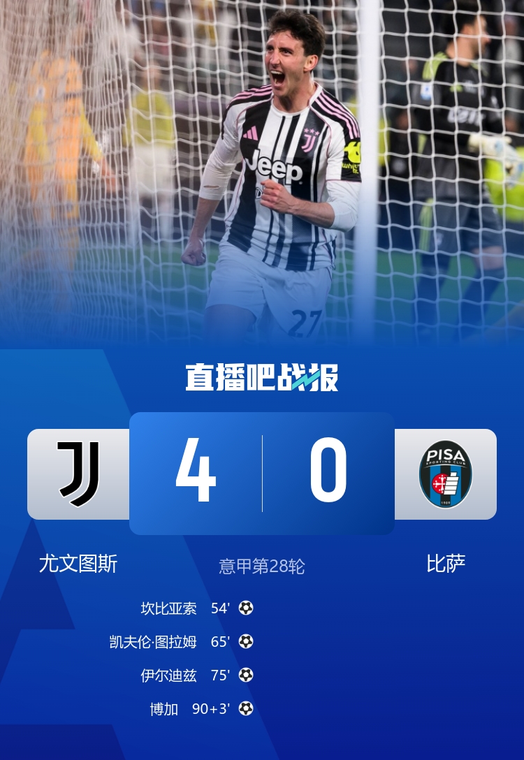 比赛的上半场,双方在攻防两端频频交锋,却始终无法攻破对方的防线,直到下半场才打破了僵局。第54分钟,场上局势终于有所改变。尤文图斯的伊尔迪兹在禁区右侧底线附近做出果敢的倒三角传球,坎比亚索随后在后点奋力一顶,球疾速飞入网底,尤文1-0领先,比萨的防线终于被撕开。