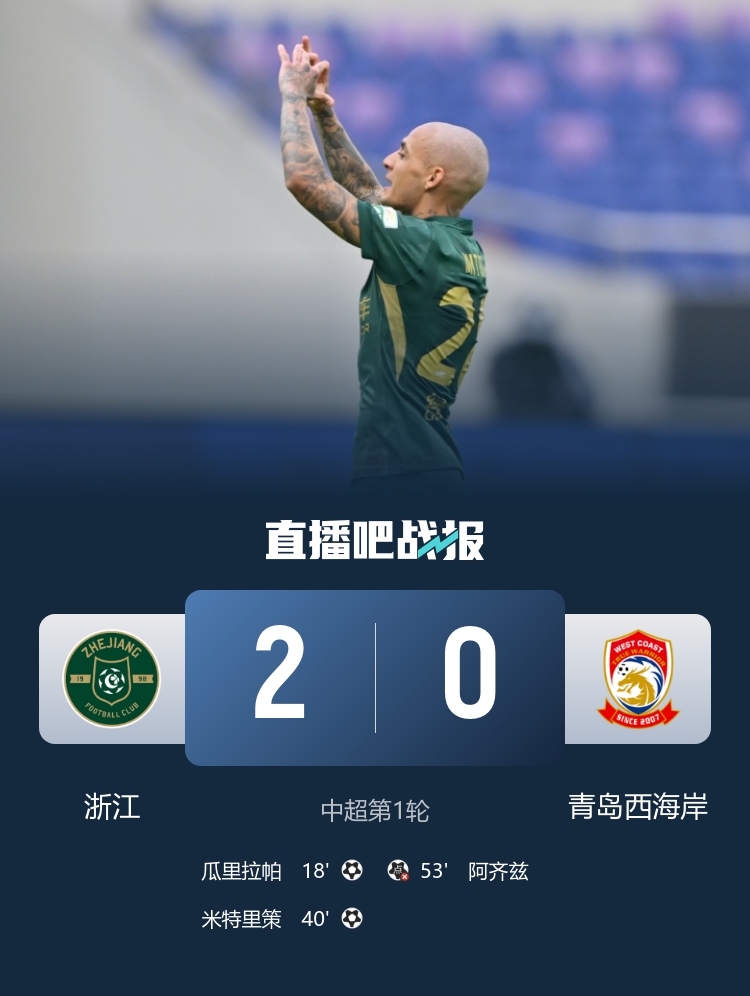 随着裁判吹响全场比赛结束的哨声,浙江队以2-0的比分迎来了本赛季的完美开局,积分榜上暂时排名第八,而青岛西海岸则还未开得分。