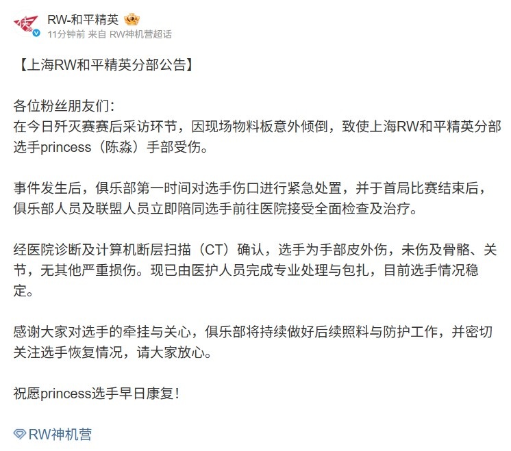 在这个不可忽视的瞬间,来自上海RW和平精英战队的动荡让人心悬。3月20日,团队向全体支持者发布了一个重要声明。就在熙熙攘攘的比赛结束后,选手princess(陈淼)在一场令人期待的歼灭赛后,被突如其来的意外袭击,造成了手部受伤,令人倍感心痛。