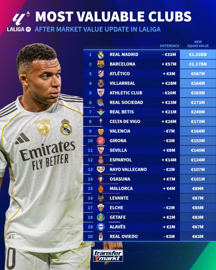 其中,毕尔巴鄂竞技和巴列卡诺的情况也让人关注,二者的身价皆下降了2000万欧元,球队在转会市场上的竞争力或许需要重新审视。皇家奥维耶多遭遇了3000万欧元的大幅下滑,总身价为6300万欧元,显然对于球队的未来计划带来了挑战。