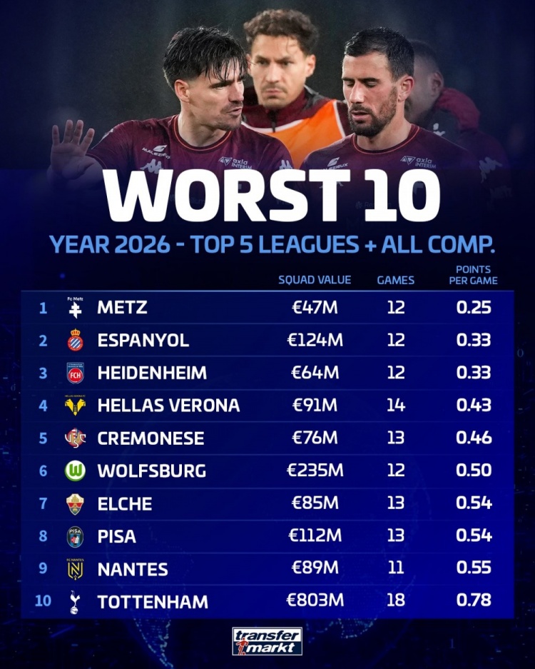 根据德国转会市场的统计,2026年五大联赛球队的场均积分最低排名前十的球队已经浮出水面。其中,法甲球队梅斯表现最为不佳,平均积分仅为0.25分。