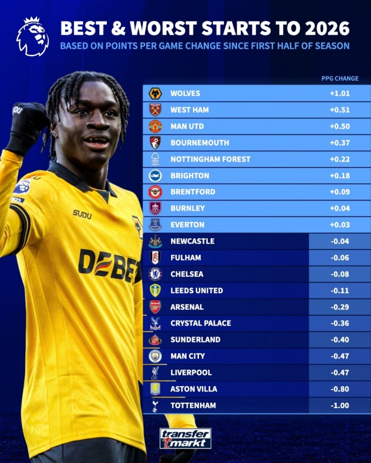 根据最新统计,2026年英超球队在赛季上半部分与下半部分的场均积分变化情况已被汇总,其中狼队以场均增加1.01分位列首位,显示出他们在下半赛季的明显进步。这一数据反映出狼队在调整战术与提升整体表现方面取得了显著成效。