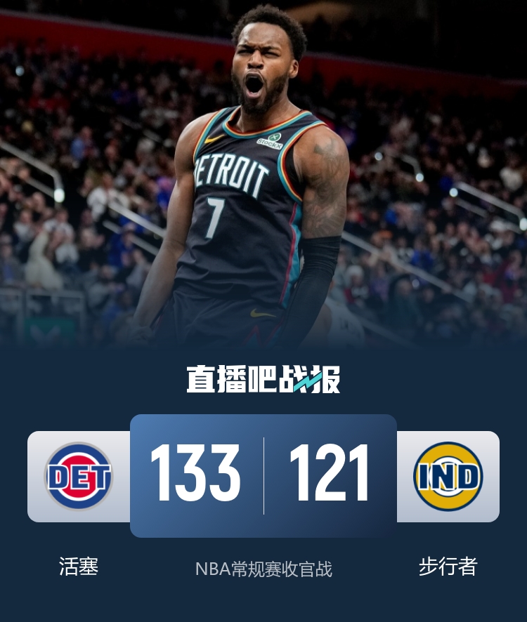 易边再战,比赛的节奏略有放缓,活塞坚持稳扎稳打,三节结束时他们依旧保持19分的优势。在最后一节,活塞率先选择将主力球员撤下,尽管步行者并没有放弃追分的努力,但最终他们未能逆转局势。最终,活塞以133-121战胜步行者,顺利完成三连胜的收官。